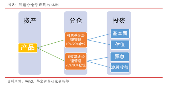 股债分仓管理运作机制:确定股票部分最高仓位,交由权益部分基金经理管理(实际上基本满仓运作),剩下由债券部分基金经理管理。主要依靠股债资产的对冲效应,以及权益部分选股时注重安全边际,来实现较为稳健的收益。