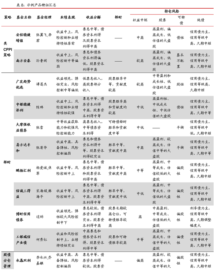 代表产品:广发趋势优选、中银稳健添利、大摩强收益债券、易方达丰和、鹏扬汇利、信诚三得益、博时信用债券、工银瑞信产业债