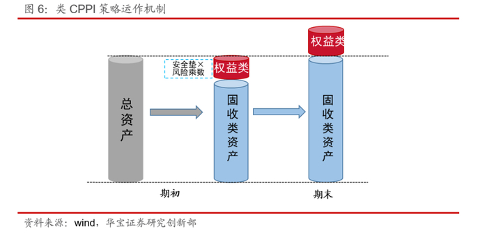 CPPI的运作机制:在运作周期内为产品设置一个期末保本目标F,期初资产净值与F的现值之差即为安全垫S,再给安全垫基础上乘以一个风险乘数M,则是期初可配置在权益资产的部分,其余资产则全部投向固收类资产。随着时间推进,权益市场若上涨,安全垫随之增厚,产品可投向权益资产的比例相应提升,捕捉市场机会;权益市场下跌,随着安全垫的降低,产品相应降权益仓位,从而实现止损保证本金安全。