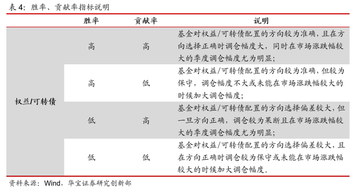 我们曾于19年5月发布研究报告《基金经理资产配置能力研究-基于基金季度持仓分析》,构建基金在股票、可转债上的胜率和贡献度指标,考察基金是否与市场行情同向且果敢地进行加/减仓操作,从而衡量基金经理在资产配置上的能力。