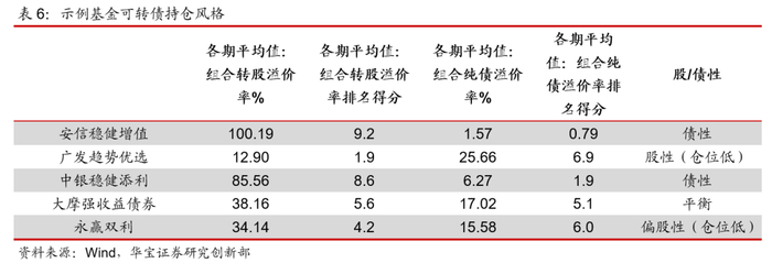 采取类CPPI策略的安信稳健增值持有的可转债债性较为显著,主要用于纯债替代,由于权益属性较弱,不会干扰类CPPI策略的实施;采取择时策略的3只基金中,广发趋势优选持有的可转债股性较强,主要基于对正股弹性的预期,中银稳健添利持有的可转债则偏债性,大摩强收益债券持有的可转债则在股性和债性中较为平衡;采取股债分仓管理的永赢双利持有的可转债偏股性,主要用于加持正股。