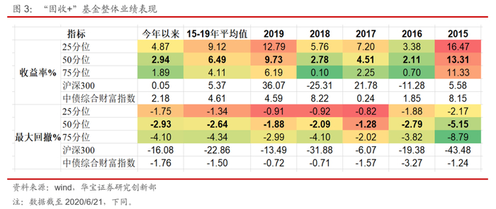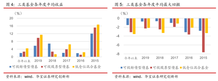 “固收+”基金2015-2019年各年收益率中位数均超过2%,平均值为6.49%,超越沪深300和中债综合财富指数各年涨跌幅平均值,同时75分位各年也均获取了正收益;今年以来,基金收益率中位数2.94%,超越同期沪深300和中债综合财富指数。而从最大回撤中位数上看,除2015年最大回撤在略超5%,各年均未超过3%,回撤控制效果较好。