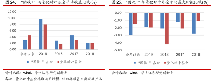 从运作结果来看,16-19年各年度“固收+”策略基金平均收益均高于量化对冲基金,今年以来量化对冲基金则表现较好,这其中原因一部分来源于15年8月后股指期货限制引起贴水的原因,近年来股指期货松绑利好该策略的发挥;回撤控制方面,16年以及今年以来量化对冲基金回撤控制较优,19年两者接近,17、18年量化对冲基金整体回撤大于“固收+”基金。