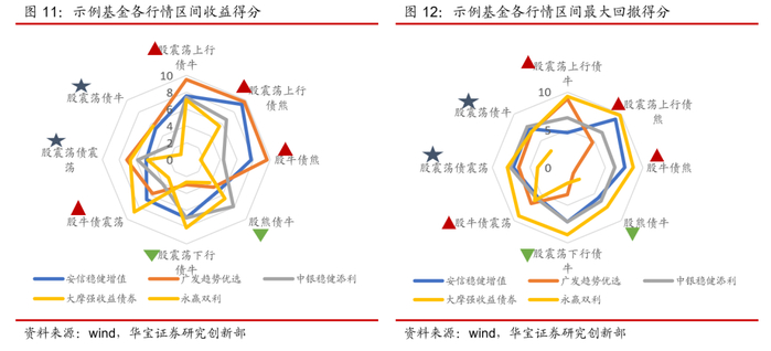 我们根据2016年以来股票、债券走势划分为8个行情区间(股票与可转债走势相关性较大,未将可转债行情划分),分别为:2016/2-2016/12股震荡上行债牛;2016/12-2017/5股震荡上行债熊;2017/5-2018/1股牛债熊;2018/1-2018/7股熊债牛;2018/7-2019/1股震荡下行债牛;2019/1-2019/4股牛债震荡;2019/4-2019/10股震荡债震荡;2019/11-2020/4股震荡债牛。接下来构建业绩得分,以便对基金业绩表现进行排序。