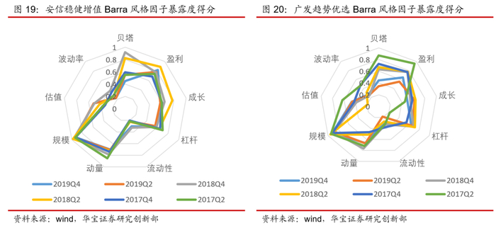 安信稳健增值——盈利因子风险暴露度较高,成长因子暴露度除2018Q2较高外其余阶段中高水平,规模因子暴露度较高,估值因子暴露度维持低位,说明基金偏好高盈利、偏高成长、低估值的大盘股。
