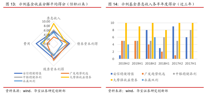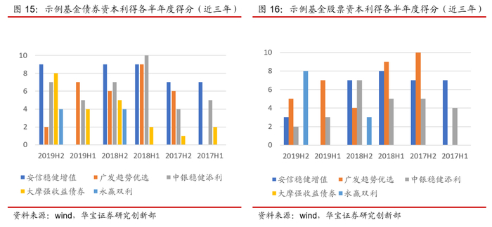 根据模型结果,票息收入方面,示例的5只基金得分差异较大,大摩强收益债券票息收益得分较高且稳定,表明基金长期进行信用下沉,广发趋势优选票息收益得分维持较低水平,其他3只则为中等水平;债券资本利得方面,永赢双利由于未配置可转债资产该得分较低,其他4只基金整体得分较为接近,安信稳健增值各期得分稳定在中上水平;股票资本利得方面,5只基金得分差异也较大,广发趋势优选得分较高,主要来源于17H2、18H1、19H1在股票投资的较优表现,安信稳健增值在股票收益获取上表现较好,而中银稳健添利相对较弱。