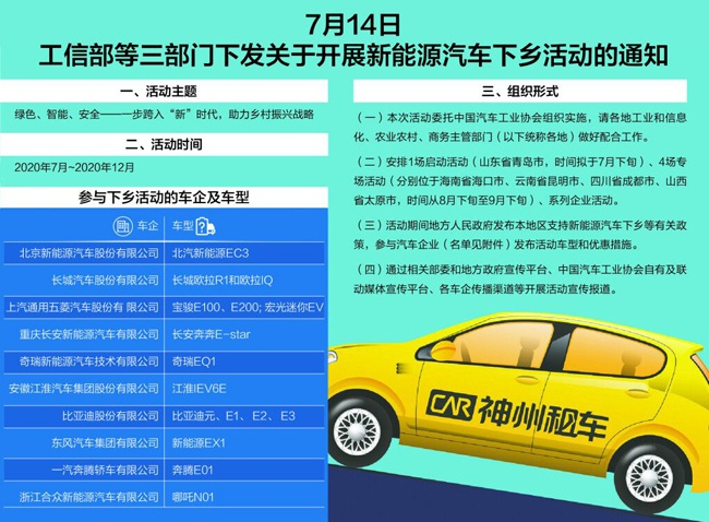 7月15日,工信部网站挂出工信部联合农业农村部办公厅、商务部办公厅共同发布的《关于开展新能源汽车下乡活动的通知》(以下简称《通知》)。《通知》称,为促进农村地区新能源汽车推广应用,引导农村居民出行方式升级,助力美丽乡村建设和乡村振兴战略,工信部、农业农村部、商务部决定从今年7月至12月联合组织开展新能源汽车下乡活动。