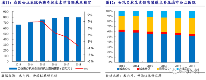 米内网数据显示,我国公立医疗机构全身用抗细菌药市场规模为1589亿元,其中头孢类抗生素销售额约800亿元,近年来基本稳定,其中城市公立医院是主要销售渠道,销售额占比超过50%。