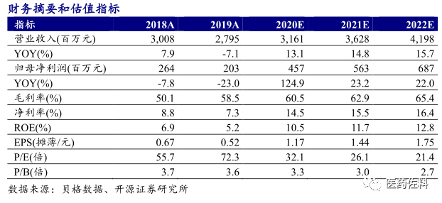 我们预计公司2020 年/2021年/2022年分别实现营业收入31.61亿元/36.28亿元/41.98 亿元,同比增长13.1%/14.8%/15.7%,归母净利润为4.57亿元/5.63亿元/6.87亿元,同比增长124.9%/23.2%/22.0%,EPS 分别为 1.17元/1.44元/1.75元,当前股价对应 PE 分别为32.1/26.1/21.4。