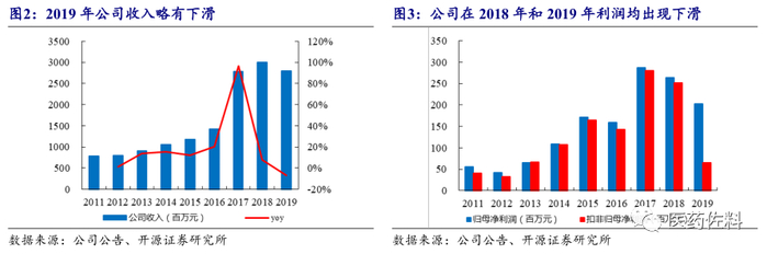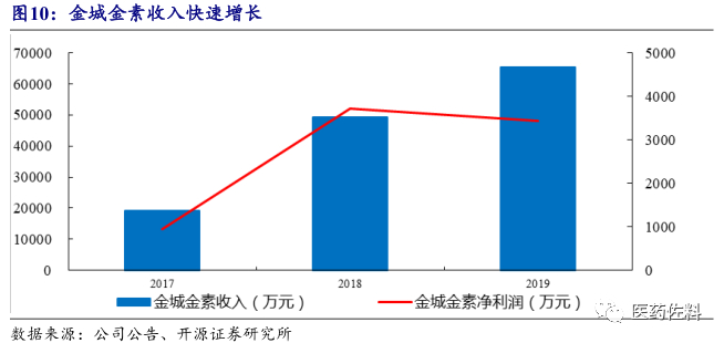 2019年公司以1.65亿元收购浙江磐谷药源67.35%的股权,间接收购金城金素33%股权,公司对金城金素持股比例上升为84%。近年来金城金素收入快速增长,2017年至2019年金城金素营业收入从1.92亿元迅速增长至6.55亿元,年报中披露的“注射用粉针剂”销量从1144.87万瓶增长到2803.35万瓶。