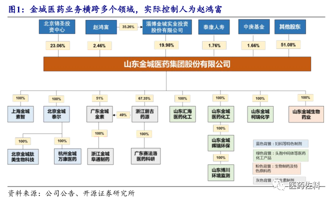 山东金城医药集团股份有限公司(以下简称“金城医药”)成立于2004年,2011年在深交所创业板上市。公司业务横跨医药中间体、生物原料药、制剂等三大领域,产品包括生物制药、头孢类医药中间体、特色原料药、终端制剂、保健品、新材料等,拥有北京金城泰尔、广东金城金素、山东金城医化等20多家参控股公司。公司实际控制人为赵鸿富,与公司现任董事长赵叶青为父子关系。