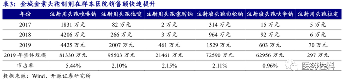 公司在头孢侧链中间体领域深耕多年,市场占有率达 60%以上。近年来公司成功切入到下游制剂领域,子公司金城金素采用“进口原料、国内分装”的模式生产高品质头孢抗生素,样本医院数据显示多个品种销售额呈现快速提升态势,但市占率仍处于较低水平,未来有较大提升空间。公司的头孢抗生素质量和疗效与原研接近,在一致性评价中占据优势。