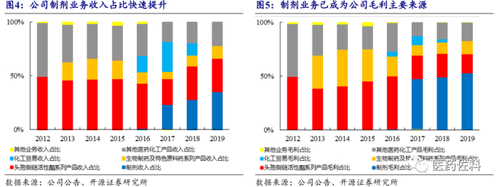 公司在上市初期以销售头孢侧链活性酯系列产品和其他医药化工产品(医药、农药中间体)为主,由于受“限抗”政策影响,需求减少,市场竞争激烈导致产品价格下滑,2012年公司业绩出现负增长。面对不利局面,公司加快升级转型步伐,2013年公司谷胱甘肽原料药产品正式投放市场,新增生物制药及特色原料药系列产品板块。2014年公司收购上海天宸药业(现改名为上海金城素智),2015年获得抗生素制剂生产企业金城道勃法51%股权,2016年公司收购主营妇科类、调节免疫类制剂的北京朗依制药(现改名为北京金城泰尔)100%股权。通过持续布局,公司制剂收入和毛利占比迅速提升,2019年制剂毛利占比已经增加到53.10%。
