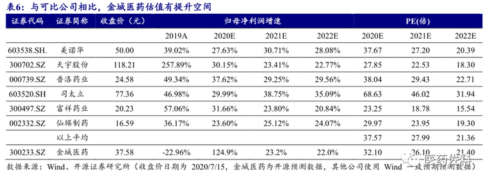 我们选择了美诺华等6家特色原料药以及原料药+制剂一体化上市公司为可比公司。与可比公司相比,金城医药估值偏低,我们认为主要是由于以下原因:1)金城泰尔业绩下滑且进行了商誉减值,对业绩形成拖累;2)近年来公司原料药新增品种偏少。我们认为随着金城泰尔业绩稳定并重回增长轨道,生物制药和特色原料药板块品种不断丰富,头孢注射剂有望借助一致性评价和集采政策贡献业绩弹性,公司估值压制因素有望逐步消除,业绩将进入稳定增长期。首次覆盖给予“买入”评级。
