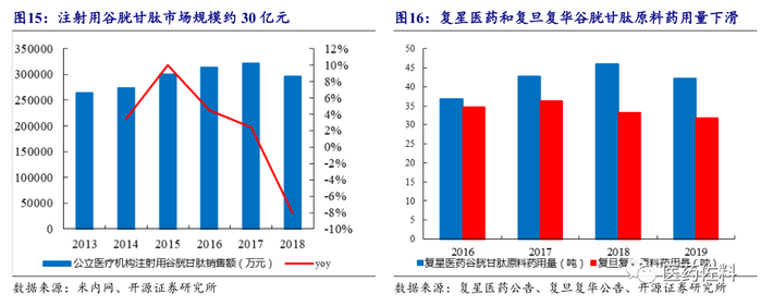 临床使用的谷胱甘肽主要以注射剂型为主,米内网数据显示2018年我国公立医疗机构注射用谷胱甘肽销售额约30亿元,主要生产厂家包括复星医药(子公司重庆药友生产)、复旦复华和绿叶制药等,受招标降价、纳入 辅助与重点监控用药目录影响,注射用谷胱甘肽销售额有所下滑。根据复星医药和复旦复华历年年报披露的销量数据测算,2019年谷胱甘肽原料药用量也出现了下降,但2019年公司生物制剂与特色原料药销量为261.62吨(+20%),表明公司谷胱甘肽销量的增长已经不单纯依靠医药市场需求驱动。