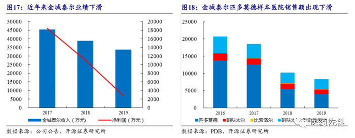 2016年公司向锦圣基金和达孜创投非公开发行股份,收购朗依制药(现更名为金城泰尔)100%股权。金城泰尔深耕特色妇儿科专科药领域,主要产品包括硝呋太尔制霉素阴道软胶囊、硝呋太尔胶囊、匹多莫德分散片、比索洛尔片、普罗雌烯系列等产品。近年来金城泰尔收入和利润有所下滑,主要由于:1) 销售渠道调整和团队整合影响;2) 匹多莫德疗效事件引发舆论和医疗界广泛关注,样本医院数据显示金城泰尔该产品销售额出现下滑,公司公告披露2017年至2019年唯田(匹多莫德分散片)分别为968.84/ 220.43/ 192.27万盒;3)公司提升品牌形象,加大市场推广投入,金城泰尔2019 年销售费用比 2018年增加6,252.01万元。