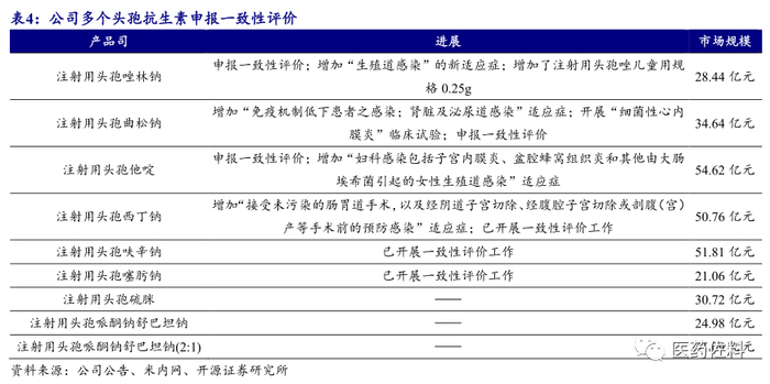 目前公司已有注射用头孢唑林钠、注射用头孢曲松钠和注射用头孢曲松钠3个品种申报一致性评价,注射用头孢西丁钠、注射用头孢呋辛钠和注射用头孢噻肟钠已开展一致性评价工作,上述品种品种市场规模合计近240亿元,若考虑其他拥有批文的品种,合计市场规模近340亿元。随着注射剂一致性评价逐步推进, 对于存量市场较大的品种,当有一定数量过评企业后可能会被纳入全国集采,公司产品市占率仍然较低,提升潜力较大,有望通过集采迅速提升市场份额,公司是注射剂集采的潜在受益者。