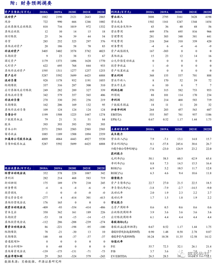 5)由于制剂收入占比逐步提升,预计2020年至2022年公司销售费用率小幅增加,分别为22.0%/22.5%和23.0%。管理费用率小幅降低,2020年至2022年分别为11.0%/10.5%/10.5%。由于公司有多个特色原料药、注射剂一致性评价项目处于在研阶段,预计研发费用率小幅提升,2020年至2022年分别为9.80%/9.90%/10.00%。