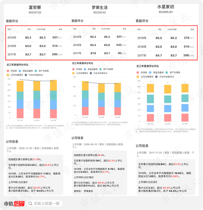 在进入财务分析部分之前,咱们先来看看这5家家纺公司在吾股大数据的评分情况。