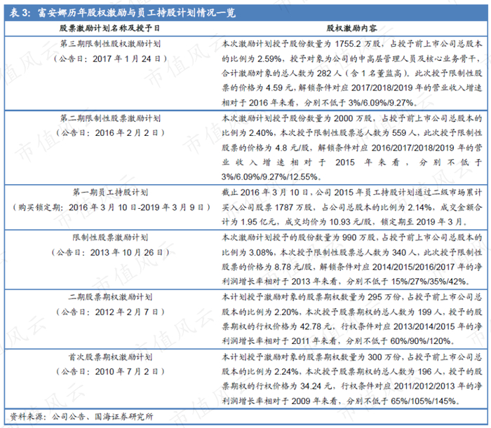 上市之后,富安娜共推出了2期股票期权激励计划、4期限制性股票激励计划、1期员工持股计划和1期经销商持股计划,是5家家纺公司中最多的。