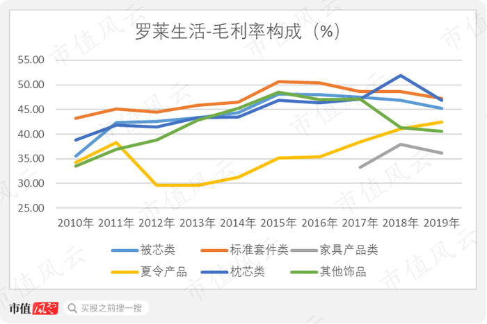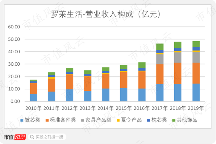 从收入构成上看,罗莱生活的产品类型主要包括:被芯类、标准套件类、夏令产品、枕芯类等等,其中,被芯类产品和标准套件类产品一直是占比最大的两大类。