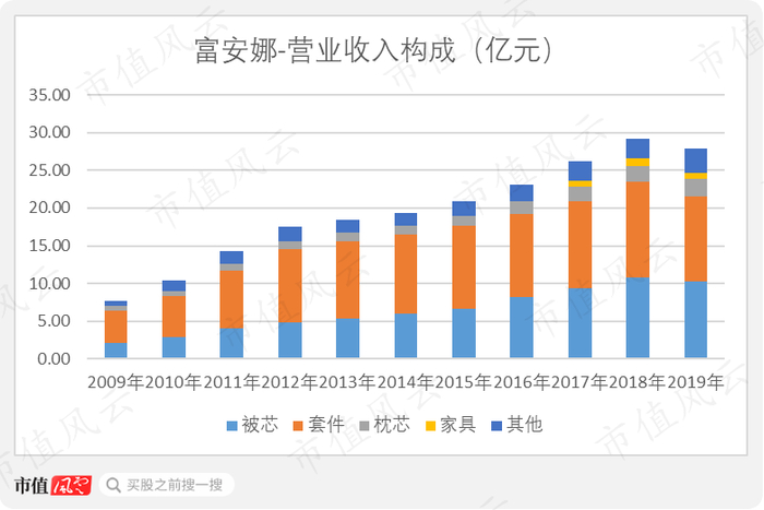 从收入构成上看,富安娜的产品类型包括被芯、套件、枕芯、家具等,被芯和套件也是其收入的两大来源。