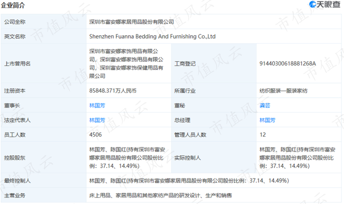 富安娜,前身富安娜家饰保健用品有限公司,成立于1994年,注册地址是广东省深圳市,于2009年在深交所上市,实际控制人为林国芳、陈国红夫妇,合计持有公司49.96%的股权。
