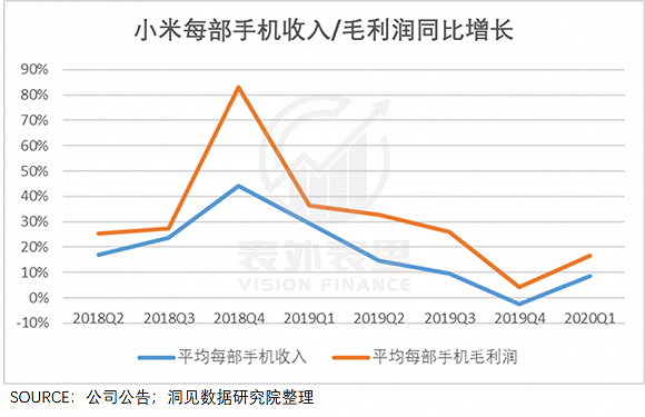 根据财报,小米平均每部手机的收入增长,总是低于每部手机的毛利润增长,2020Q1每部手机的收入同比增长了9%,而毛利润同比增长为16%。