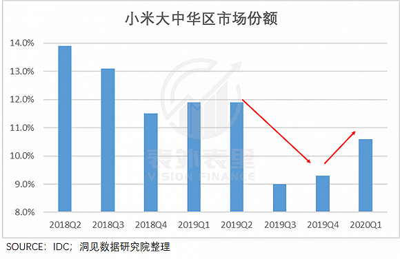 小米作为智能手机性价比的代表,也就顺应了换机早期的这部分市场,吸引了部分换机用户的青睐。这一点也在小米手机近三个月的销售情况上有所体现。2019年Q3季度,小米手机在大中华地区市场份额跌至9%,之后的两个季度开始反弹,特别是今年Q1季度,其市场份额涨回到10.6%,有持续反弹的迹象。