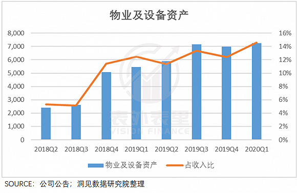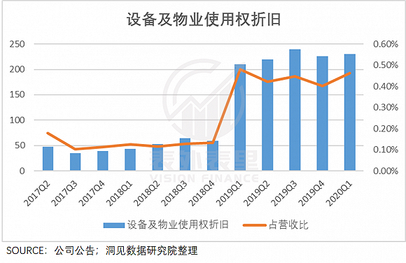 2018Q4之前,其设备物业折旧占营收比总在0.1%左右,然而2019Q1开始,该数据突然飙升至0.48%,此后也基本在0.45%以上。