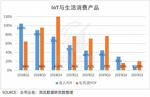 在IOT业务中,也能看到这样的毛利润同比增长,大于收入同比增长。尤其在2018Q3之后,这样的趋势更为明显了。(2019Q4收入增长大于毛利润增长是因为年终大促,智能电视及一些明星产品的销量猛增,但此时没有形成足够的成本规模化优势,所以年终大促一定程度上是为了“冲销量”进行了“让利”。)