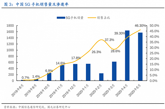 事实上,虽然受到了疫情的影响,但国内消费者对5G手机的购买力仍较大范围存在——从目前国内5G手机的销售情况来看,在遭遇今年1、2月疫情影响下的销量下跌后,3月份开始5G手机的销量在国内迅速上涨,整个5G手机市场开始反弹。根据中国信息通讯研究院数据,截止到2020年5月,国内5G手机的销售占比达到46.3%。