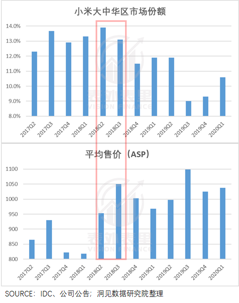 2018Q2,小米大中华区的份额提升到了13.9%的最高点,这个季度小米顺势推出旗舰机小米6,价格定在2000元以上,ASP从818涨到了953元。