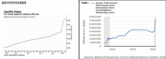 美联储宣布将维持零利率直至经济复苏,并亲自下场为市场增添流动性(买入公司债ETF等),资产负债表更是从原来的四万多亿美元一度突破七万亿美元、美国M2供应量激增。
