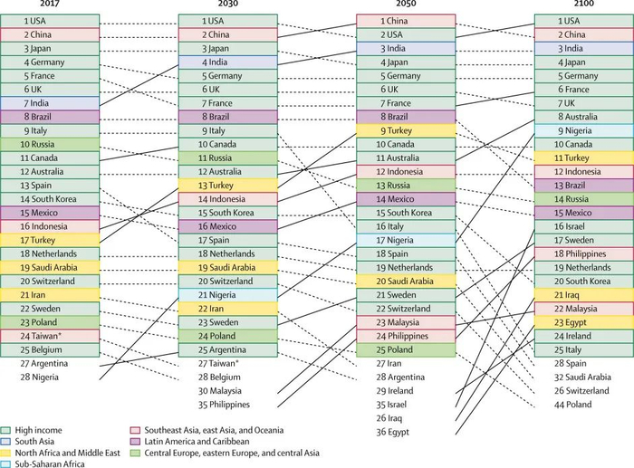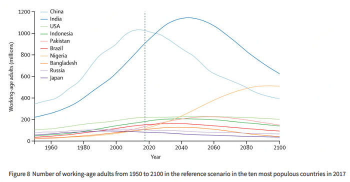 报告预计,从2017年到2100年,23个国家(包括日本、泰国和西班牙)人口预计将下降超过50%,中国人口预计将减少48%。到2100年,五个人口大国依次是印度(10.9亿)、尼日利亚(7.91亿)、中国(7.32亿)、美国(3.36亿)和巴基斯坦(2.48亿)。