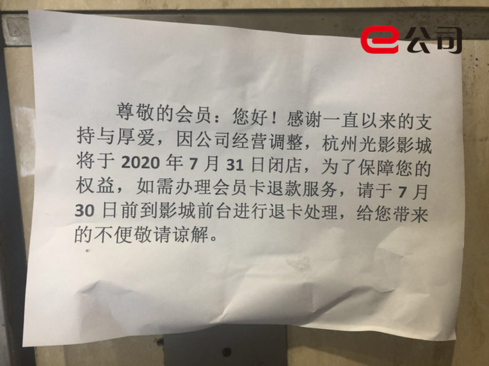 在一楼的电梯口,贴着一张没有落款日期的告示:“因公司经营调整,杭州光影影城将于2020年7月31日闭店,为了保障您的权益,如需办理会员卡退款服务,请于7月30日前到影城前台进行退卡处理,给您带来的不便敬请谅解”。