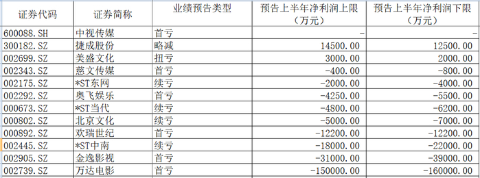 Wind统计显示,12家公布2020年上半年业绩预告的影视动漫(申万行业类)上市公司,首亏企业包括万达电影、金逸影视等6家,继亏企业包括北京文化、*ST当代等4家。