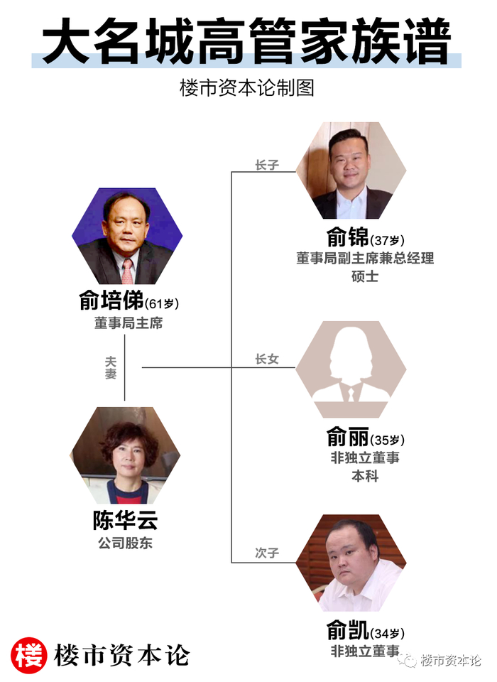 楼市资本论注意到,在最新的大名城的高管中,不少是俞培俤的亲信。其妻陈华云为公司股东;其长子俞锦为董事局副主席兼总经理;女儿俞丽及次子俞凯均为非独立董事。