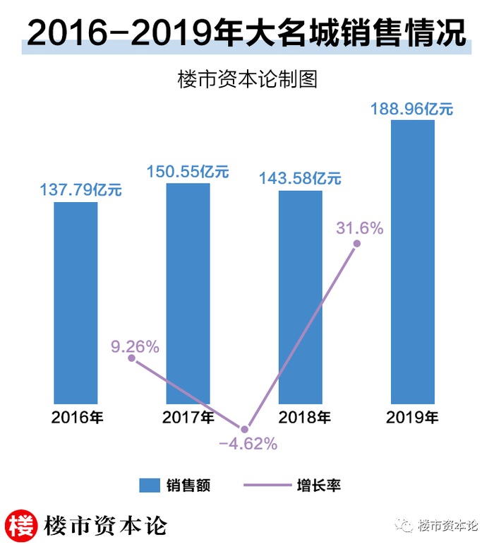 楼市资本论了解到,2016-2019年,大名城房地产销售额分别为137.79亿元、150.55亿元、143.58亿元和188.96 亿元,近3年增长率分别为9.26%、-4.62%、31.6%,规模未能突破两百亿,业绩增长不容乐观。