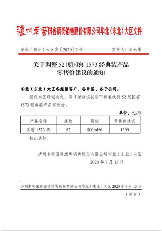 7月15日,泸州老窖华北(东北)大区发文件,对52度国窖1573经典装零售价建议1399元/瓶。