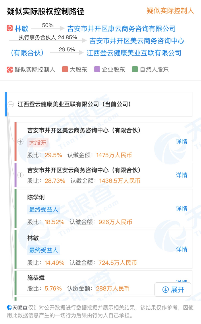 天眼查显示,江西登云健康美业互联网有限公司成立于2014年,2016年启动集团化运营,注册资本5000万人民币,经营范围包括互联网生活服务平台;化妆品、护肤品研发与销售;理发美容;休闲、保健健身活动等。吉安市井开区美云商务咨询中心持股29.5%,为公司大股东,法人代表为林樟。