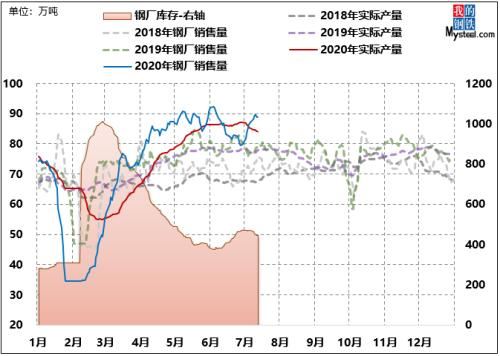 钢厂端:钢厂订单受到需求快速恢复且集中释放的拉动,上半年快速回归至高位,供需错配严重。5月初到6月初,由于市场库存去化效果显著,开始出现主动补库情绪,钢厂订单达到上半年峰值。而后,受南方地区暴雨影响,库存出现拐点,市场也由主动补库转为被动补库。现阶段正处于被动补库的周期,订单小高峰有望在近期形成,而产量趋势性下降可能性不大,预计7-8月份,钢厂产销端将逐步进入纠缠态势。