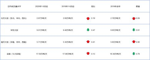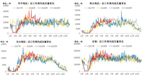 从数据上看,得益于雄安新区的大力建设,2020年北方大区日均成交量水平高于2019年上半年和2019年全年;南方大区则是受到华中地区需求在疫情结束后爆发的提振,日均成交量水平高于2019年上半年和2019年全年;反观华东地区,需求表现不及预期。全国来看,上半年日均成交量水平高于2019年上半年,但低于2019年全年日均成交量水平。表明需求在3-5月份集中爆发,需求力度分化,整体需求水平不高。