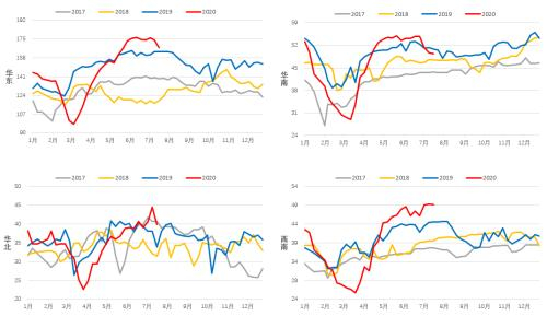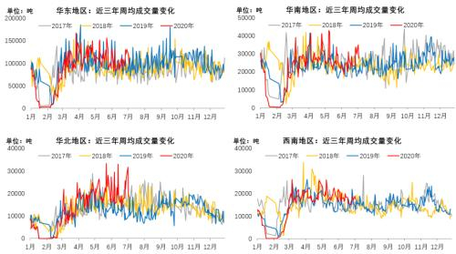 得益于国内疫情控制效果显著,国内下游需求三月份开始迅速恢复。分区域来看,华东地区需求快速复苏,单日成交量峰值出现在3月底;华南地区需求快速恢复,单日成交峰值出现在4月初;华北地区需求延后,但爆发力惊人,成交峰值出现在5月下旬;西南地区快速复苏,平滑期无较大波动,较去年同期偏好;