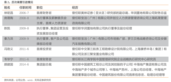 职业经理人模式的探索并逐步稳定管理团队:龙湖集团是 较早引进职业经理人的上市民营房企之一,08 年引进林钜昌先生为公司首席财务官、09 年引进陈凯先生为公司集团运营及投资发展部总经理至 14 年引进颜建国先生担任集团副总裁,均为中海系或者华润系的高管。2011 年吴亚军女士辞任集团 CEO,并由邵明晓先生接任 CEO 一职后,公司职业经理人团队的构建步伐进一步加快,并且逐步形成了较为稳定的管理团队。