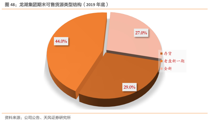 从期末可售货源的角度看:期末可售货源4100亿元,以城市能级区分,期末可售货源主要集中于领先二线(41%)、一线城市(17%)、其他二线(24%),环城市卫星城及三线城市占比18%,货源以一二线核心城市为主。以区域划分,期末可售货源主要集中于长三角区域(28%)、环渤海区域(24%)、西部地区(21%),华南及华中区域占比合计约27%。以可售货源的类型划分看,期末可售货源中存货占比29%、老盘新一期占比44%、全新货源占比27%,货源类型以新推货源占主力;较上年的区别在于全新项目比例降低,而老盘新一期占比提高。