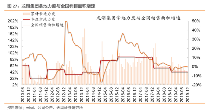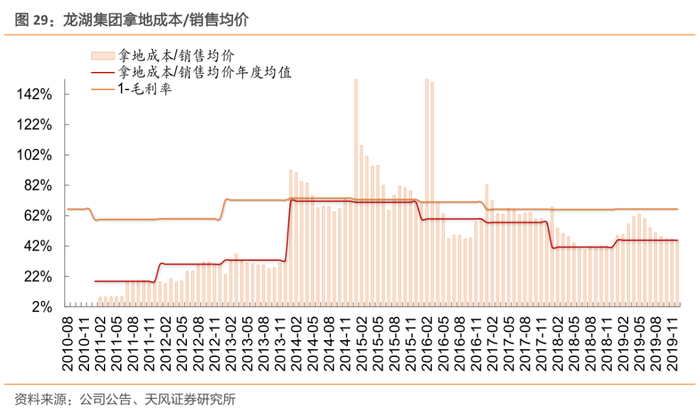 3)投资上的稳健:龙湖集团投资决策相对稳健,体现为规模上台阶后,公司对于土地储备的增加更多取决于消耗的土储的情况、拿地金额/销售金额的比重基本维持在40%-50%的区间内;
