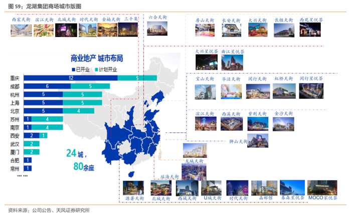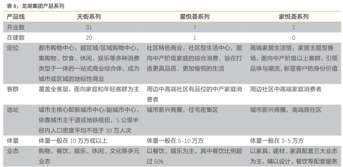 龙湖集团自2002年开发首个商业项目——重庆龙湖北城天街购物中心,标志其进入商业运营领域,2003年重庆北城天街购物中心开业,商业经营管理分公司成立;经过近廿年的发展,龙湖集团目前已经形成“天街、星悦荟、家悦荟”三大商业业态品牌,并成长为中国商业地产百强第7。