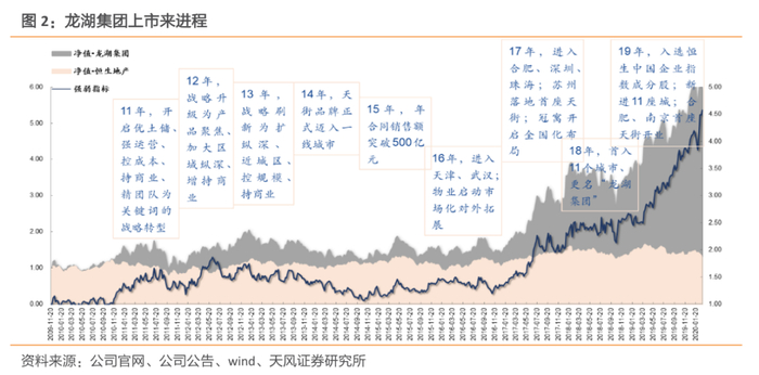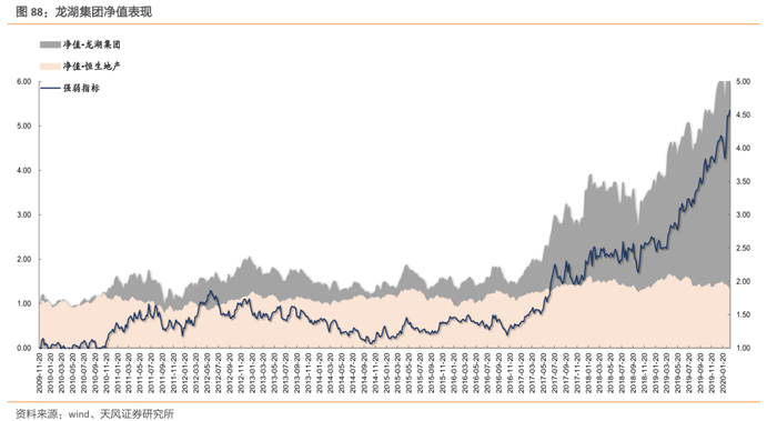以2009年11月20日龙湖集团上市首个交易日为基准,我们计算了龙湖集团与恒生地产自2009年11月20日至2020年2月28日的净值表现及相对强弱指标的表现。09年至10年末,相对强弱指标显示龙湖集团并未跑赢恒生地产指数;2011年开启战略转型后,龙湖集团在11年至12年上半年有较强表现,12年上半年至16年则回吐了部分超额收益;公司行情的启动始于17年初,并于17年至今实现了净值由1.39提升至5.92,实现三年三倍增长,年化超额收益率62%。