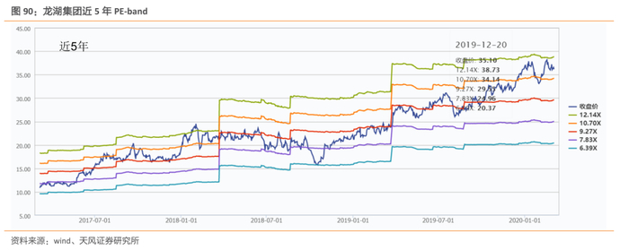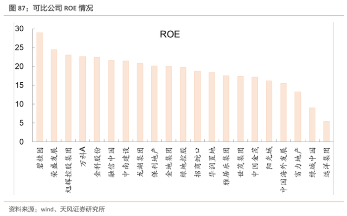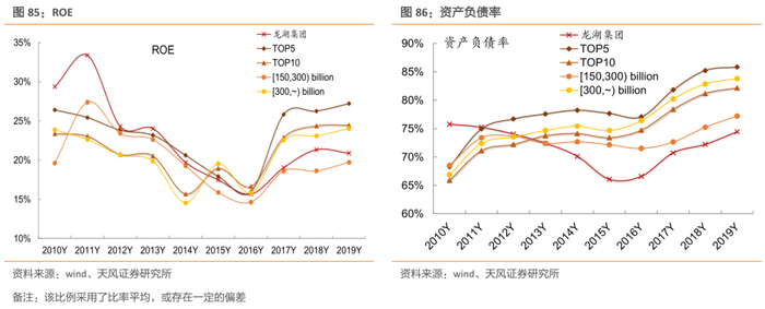 考虑到样本组的ROE按照各类公司ROE进行平均计算所得,存在一定的偏差。因此,我们也将行业内的公司的ROE水平做一个直观比较。截止2019年度各家公司平均ROE的水平表现看,龙湖集团处于可比公司中上水平。